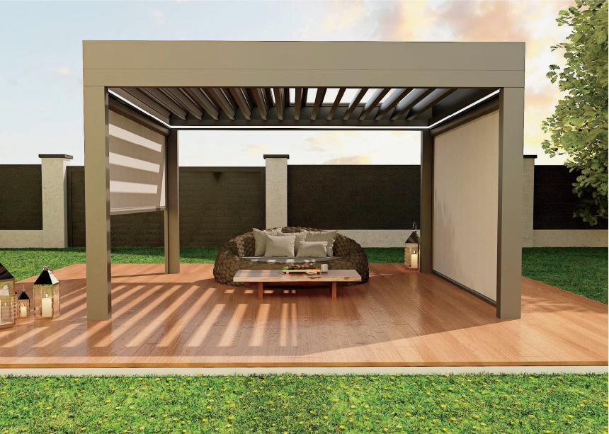 Bioklimatska pergola je sistem z dvojnim delovanjem, za razliko od vseh konkurentov, zahvaljujoč svojemu 3-motornemu sistemu. Plošče se zavrtijo okoli svoje osi do 110 stopinj glede na položaj sonca. Nato se zvijejo nazaj, kar omogoča popolnoma jasen pogled na nebo.